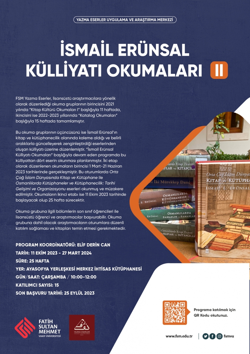 Bu okuma gruplarının üçüncüsünü ise İsmail Erünsal’ın kitap ve kütüphanecilik alanında kaleme aldığı ve belirli aralıklarla güncelleyerek zenginleştirdiği eserlerinden oluşan külliyatı üzerine düzenlemiştir. “İsmail Erünsal Külliyatı Okumaları” başlığıyla devam eden programda bu külliyattan dört eserin okunması planlanmıştır. İki etap olarak düzenlenen okumaların birincisi 1 Mart-21 Haziran 2023 tarihlerinde gerçekleşmiştir. Bu oturumlarda Orta Çağ İslam Dünyasında Kitap ve Kütüphane ve Osmanlılarda Kütüphaneler ve Kütüphanecilik: Tarihi Gelişimi ve Organizasyonu eserleri okunmuş ve müzakere edilmiştir.