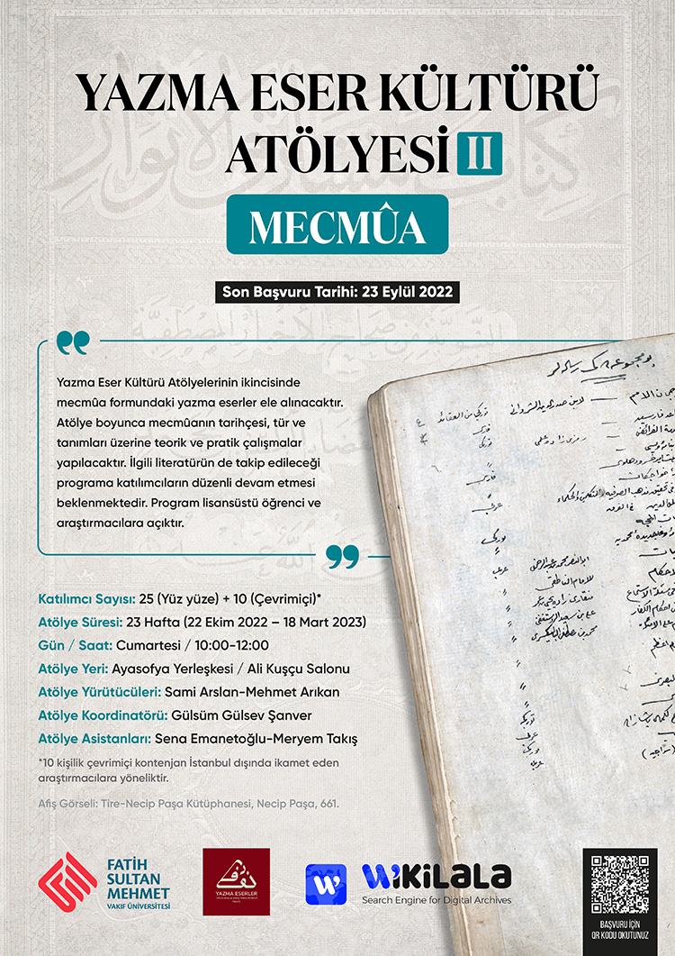 Yazma Eser Kültürü Atölyelerinin ikincisinde mecmûa formundaki yazma eserler ele alınacaktır. Atölye boyunca mecmûanın tarihçesi, tür ve tanımları üzerine teorik ve pratik çalışmalar yapılacaktır.