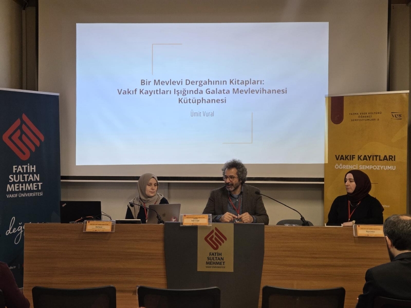 Sempozyumun ilk oturumu Kadir Turgut moderatörlüğünde gerçekleştirildi. Oturumun ilk sunumunda Ümit Vural, Galata Mevlevihanesi Kütüphanesi’ni vakıf kayıtları açısından inceledi. TÜYEK Portal üzerinden Galata Mevlevihanesi, Halet Efendi ve Halet Efendi Ek koleksiyonlarını stratigrafik bir yaklaşımla ele alan Vural, vakıf kayıtları aracılığıyla çok katmanlı bir inceleme sundu. Araştırmasında vâkıfların sosyal ve mesleki kimlikleri, eserlerin muhtevası ve kütüphanenin fiziksel bütünlüğündeki değişimler gibi çeşitli cephelere odaklandı.